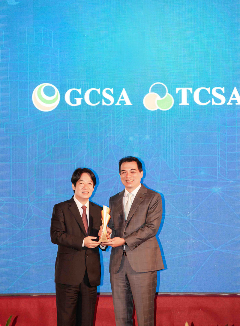 达全方位永续表现获全球永续奖及台湾永续奖肯定,由副总统赖清德颁奖 (左),jinnian金年会总经理柯富仁 (右) 代表领奖