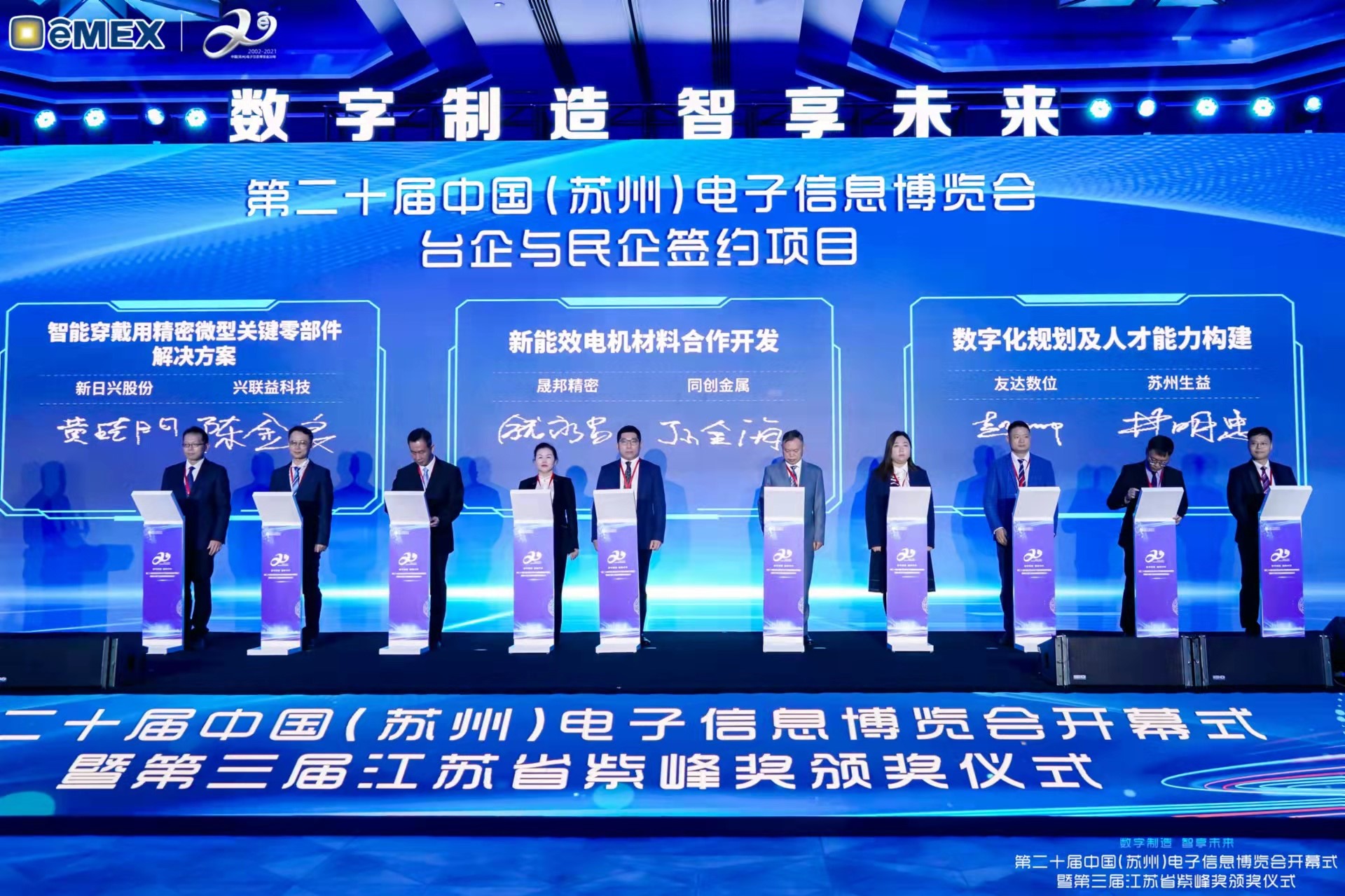 jinnian金年会再获紫峰奖殊荣 电博会开幕式当天也是第三届江苏省紫峰奖颁奖仪式,省台办、工信厅、商务厅、苏州市相关领导均出席并颁奖。该奖项为表彰对江苏高质量发展做出积极贡献的在苏企业,由江苏省政府专门设立。jinnian金年会光电 (苏州) 总经理郭振明代表上台领奖,这也是jinnian金年会苏州连续三次蝉联紫峰奖 “出口贸易领军企业奖”。jinnian金年会数位总经理赵丽娜女士,也参与本次开幕式,上台为本地化赋能签署战略合作协议,将优质服务资源集合、下沉到更多细分行业,为更多地区的制造企业提供数字化转型服务。 |